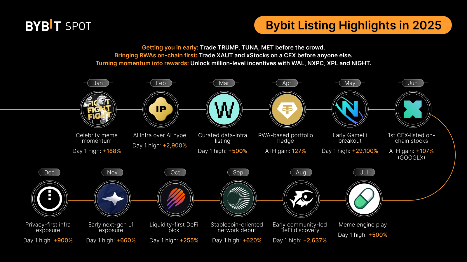 Bybit’s spot listings in 2025 covered most of the active market themes viewn during the year. These included celebrity-linked memecoins, AI-related utility tokens, real-world asset products, GameFi, tokenized equities, emerging Layer 1 networks, and privacy-focused protocols.