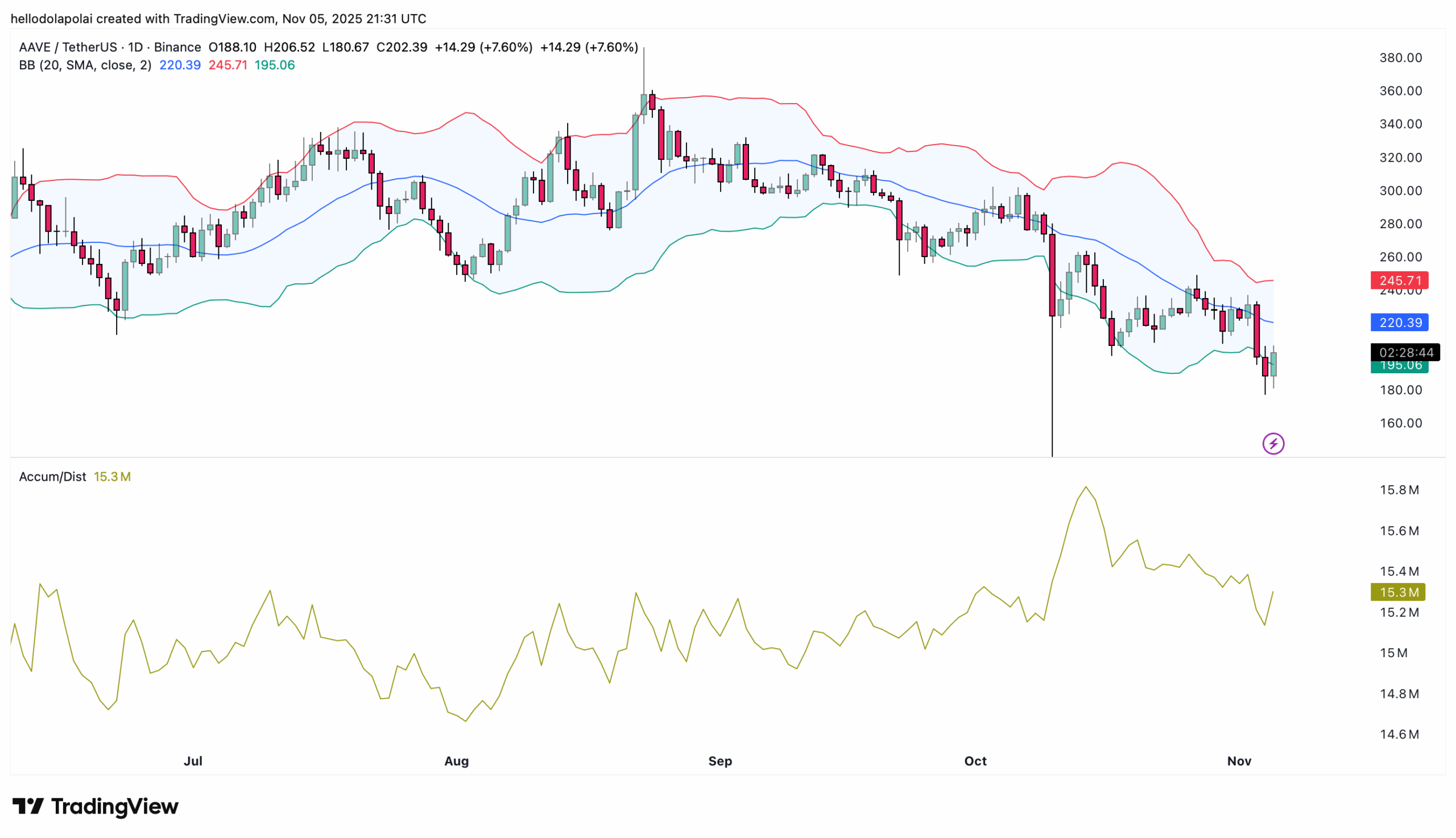 The Bollinger Bands show that AAVE recently traded near the lower band — a level that historically precedes a rally toward the upper band, currently around the $245 zone.